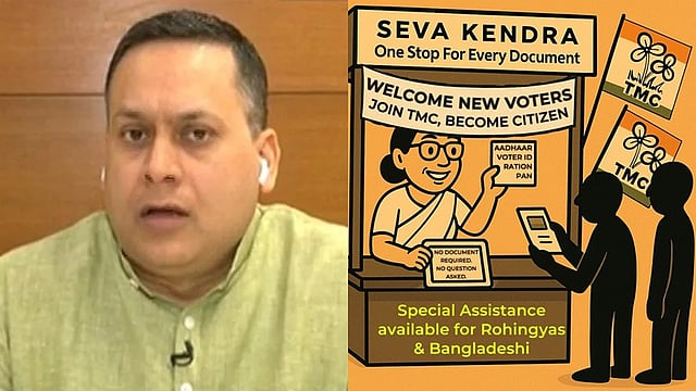 In the cartoon, a portrait of a woman (arguably featuring West Bengal Chief Minister Mamata Banerjee) is seen behind a counter with the hoarding -- “Seva Kendra- One stop for every document”. The counter window has three taglines, namely -- “Welcome New Voters, Join TMC, Become Citizen”, “AADHAAR, Voter ID, Ration, Pan”, and “No document required, no question asked”.