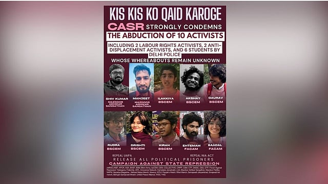 NEW DELHI — The Campaign Against State Repression (CASR) has issued an urgent statement condemning the alleged abduction of ten individuals by the Delhi Police and other state agencies. The missing persons include two labour rights activists, two anti-displacement activists, and six students whose current whereabouts remain entirely unknown.