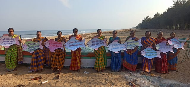 In Tamil Nadu and Puducherry, beaches turned into spaces of resistance—the Karaikal Fisherwomen Federation mobilised ten villages, Nagore Sangam members performed art by the sea, and Sangam women in Kottai Medu, Mayiladuthurai, drew kolam art as a symbol of defiance. In Thiruvarur, the Tamil Nadu Women Fishworkers Union hosted programmes bringing together coastal women to assert their rights and strengthen solidarity.