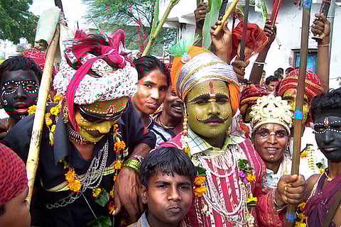 Gavri features wooden weapons, clay-made musical instruments like the "Mandal," and other symbolic props, indicating its origins predating the knowledge of metalworking. The performances, known as "खेल," "भाव," or "सांग," are enacted by men, even in female roles, and are an expression of devotion that transcends familial and social duties for the duration of the ritual.